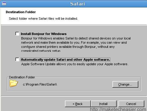 Haga clic en » Next » para continuar con la instalación. Cuando llega a la página que le pregunta si desea instalar Bonjour y Actualización de software , desmarque la selección.
