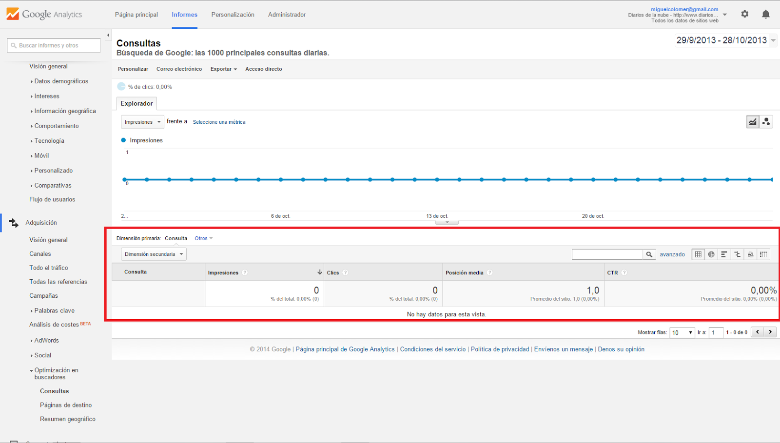 En el menú de la izquierda de Google Analytics haz "clic" en la opción Adquisición, y dentro de ésta, haz "clic" en "Optimización en buscadores" y a su vez finalmente en "Consultas":