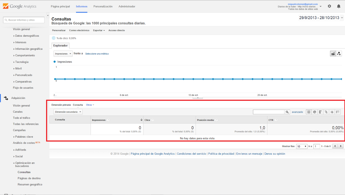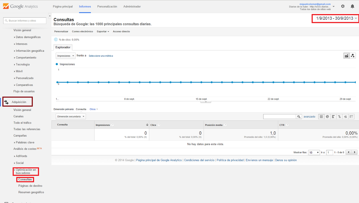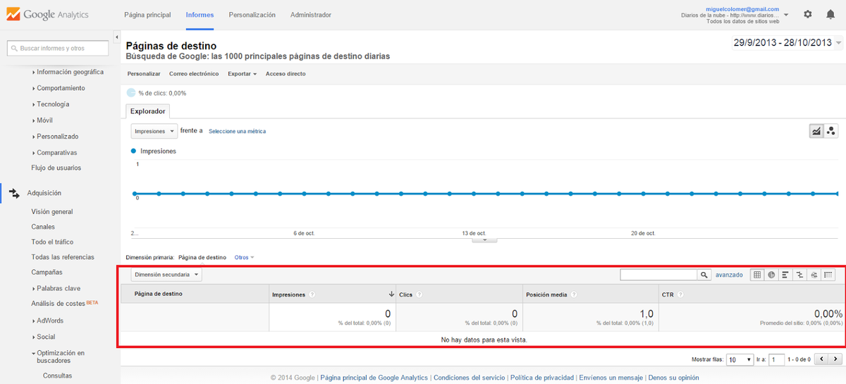 Por defecto, Google te pondrá el últimos mes, tú podrás ajustar un año entero, unos cuantos meses, un día... lo que prefieras para visualizar la valiosa información que a continuación te expongo.
