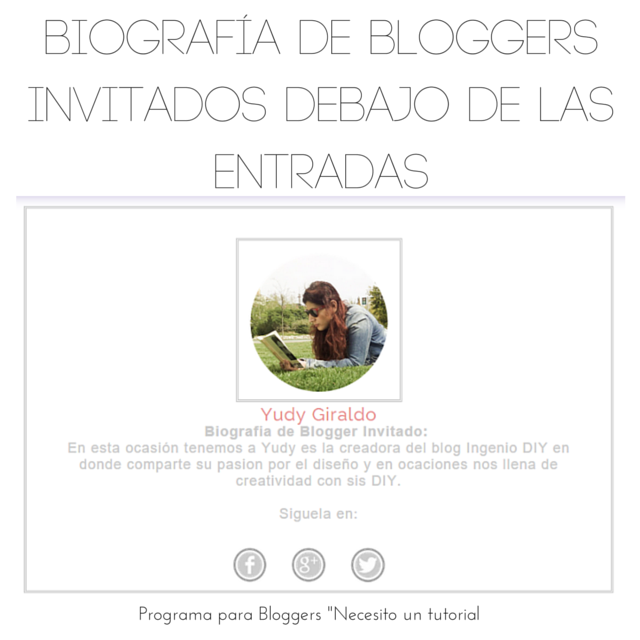 Una chica Blogger a la que admiro mucho me pidió mediante mi Programa para blogger "Ayúdame, necesito un tutorial" me pidió que hiciera un tutorial de poner el autor invitado debajo de cada post. No fue nada fácil, no encontraba mucha información que digamos, así que en casi el 100% cree una caja en donde se destaca el autor, se le puede hacer una pequeña biografía y ademas de eso con los iconos sociales básicos para que los lectores se enteren de quien es.