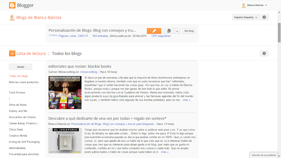No sé si llegásteis a conocer Coral Avenue. Lo vamos a cerrar, pero si os fijáis en el diseño, no tiene las caritas de seguidores... y sin embargo sí un botón o icono con la B de Blogger arriba a la izquierda: