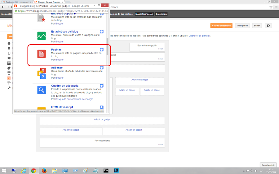 4) Selecciona en la pantalla que te sale el Gadget de Google "Páginas", tal y como te marco en el pantallaoz inferior.