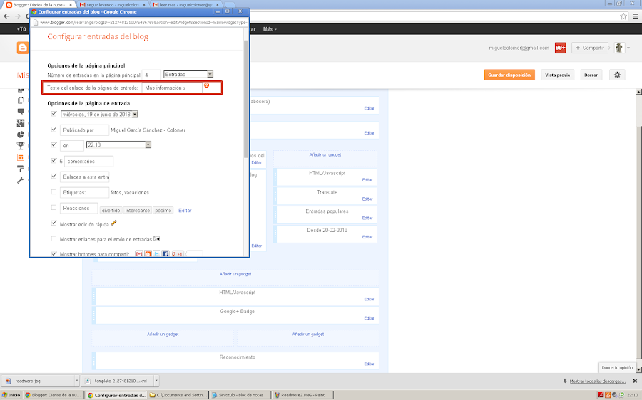 2) Si hacemos "clic" en el Gadget central "Entradas del Blog", nos aparecerá una pantalla con una caja de texto con el literal "Texto del enlace de la página de entrada:". En él podemos cambiar el texto por defecto para poner otra cosa en lugar de "leer más" y podremos activar su funcionalidad para que se presente el resumen en la página principal del Blog con ese texto.