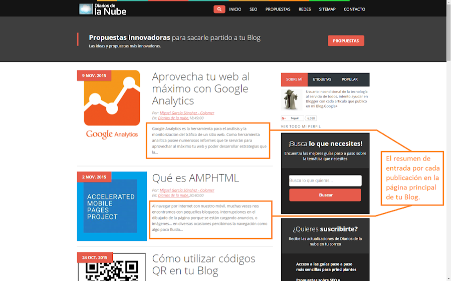 Igualmente, si no se utiliza el "Leer más", el usuario podrá acceder al detalle de la entrada haciendo "clik" en el título o la imagen de portada de la misma.¿Cómo pongo el resumen de entrada en mi Blog?