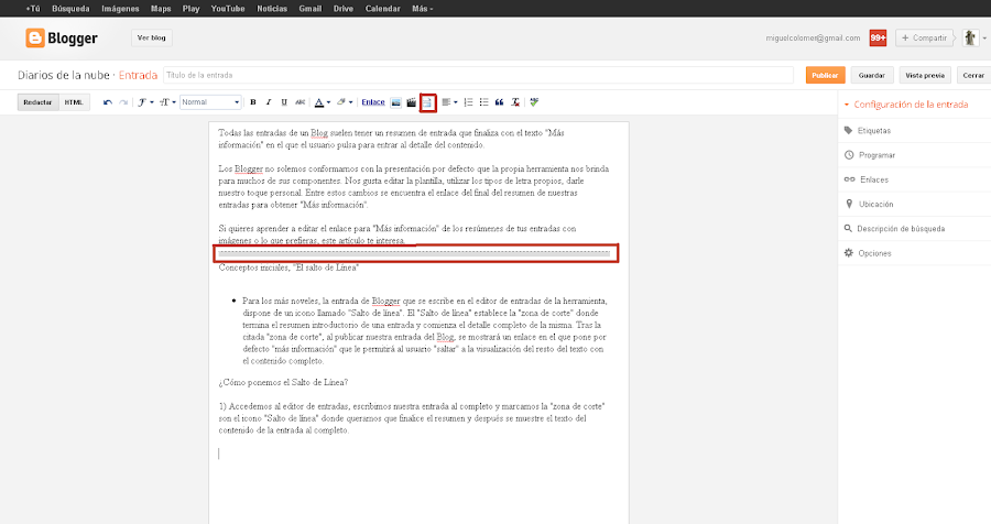 3) Por último, en aquellas entrada donde necesites mostrar el resumen de entrada en la página principal de tu Blog, haz lo siguiente: