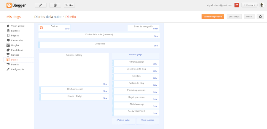 Dentro de Blogger nos fijamos en el menú de la izquierda y pulsamos sobre la opción "Diseño".