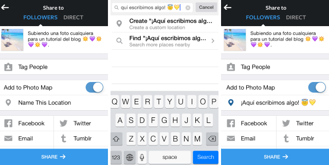 Paso 1 - Subimos la foto como de costumbre escribiendo nuestro texto, etiquetas, etc. y activamos la opción de Añadir lugar (no sé cómo sale en castellano, mi móvil está todo en inglés ;)