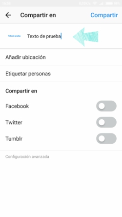 * Una vez la tengamos elegida, editamos o le ponemos un filtro, damos a siguiente y llegamos al apartado donde añadimos el texto. Aquí escribimos el pie de la foto que queremos que le acompañe, agregamos ubicación y etiquetamos si es necesario, y marcamos si queremos que ademas se comparta en otras redes sociales.