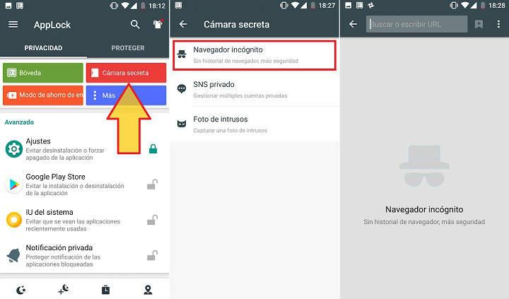 Otra de las utilidades interesantes que ofrece Applock es un navegador de incógnito, al que podemos acceder desde la pestaña “Privacidad -> Cámara secreta”. Es un navegador tirando a sencillito, pero la verdad es que funciona bastante bien.