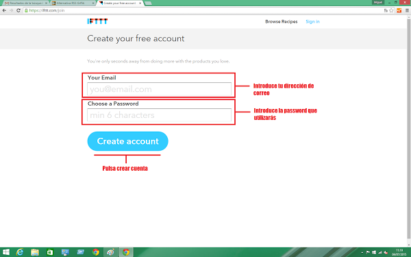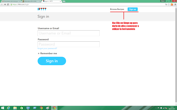 1) En primer lugar haz clik en https://ifttt.com y accederás a la pantalla inicial de la aplicación. Pulsa en "signup" como te muestro en la pantalla siguiente para darte de alta y poder utilizarla.