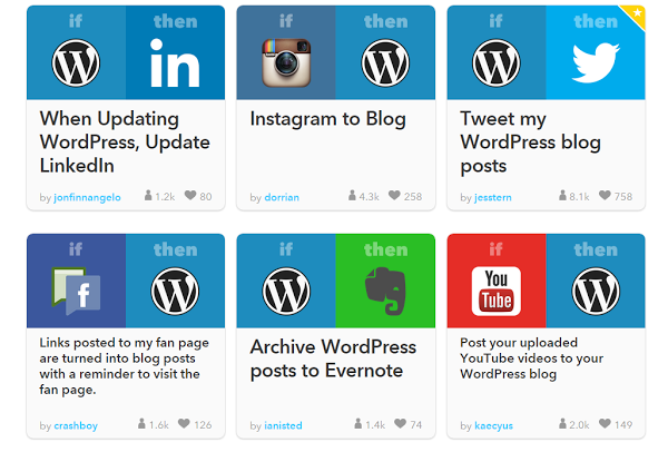 Ejemplo 1. con un recipiente que publica en Facebook cada vez que publicas en Blogger: If publico un nuevo post en Blogger entonces publícalo en Facebook. Ejemplo 2. Con un recipiente que publica en Twitter cada vez que publicas en WordPress: If publico un nuevo post en WordPress entonces publícalo en Twitter.