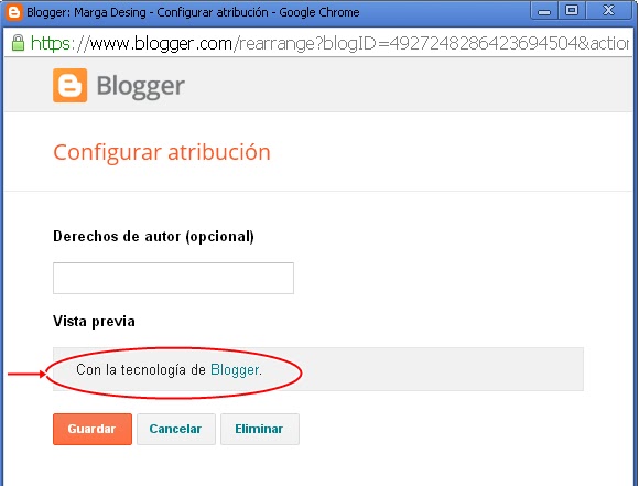 Ahora entráis en el gadget de atribución desde Diseño y ahora sí que os aparecerá el botón "Eliminar". Ya podéis quitar definitivamente la Atribución de Blogger.