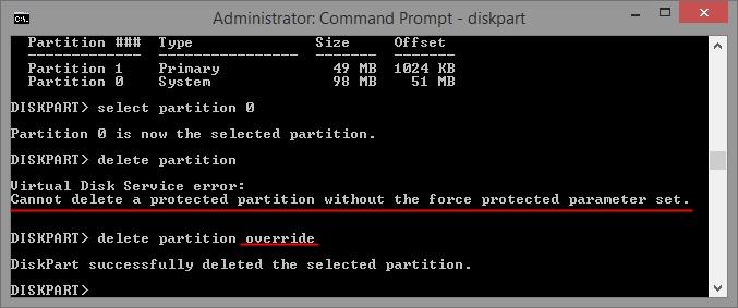 A continuación, escriba Eliminar partición y pulse Entrar. Si da un error como el que se muestra a continuación, puede añadir override al final e intentarlo de nuevo. Continúe haciendo esto hasta que sólo quede la partición Primaria.