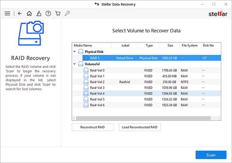- Seleccione el volumen RAID deseado cuyos datos desea recuperar y haga clic en Escanear.