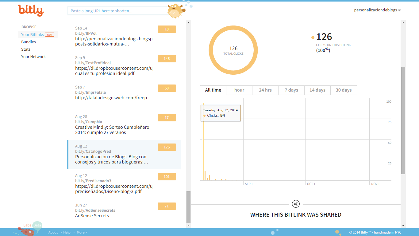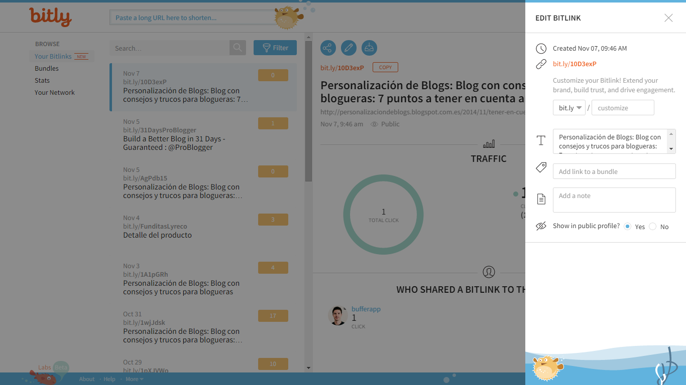 Realmente todo viene porque yo le recomendé a Amparo (a la que ya todas conocéis pues hablé de ella y su caso en este post y también en el final de este otro post, y a la que tengo mucho cariño) que usara Bitly para saber cuánta gente pinchaba en un enlace determinado y ella me escribió más tarde o al día siguiente un email preguntándome a ver si tenía algún tutorial de cómo funcionaba pues al no saber inglés, no le resulta tan intuitivo.Vamos con un tutorial de Bitly