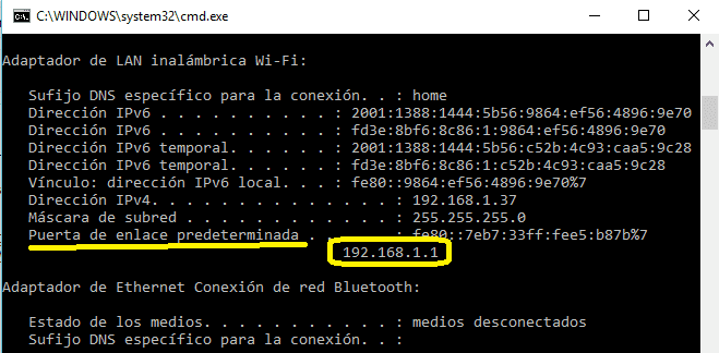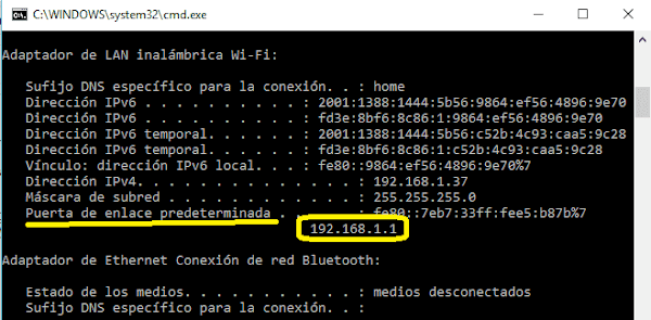 Buscamos y anotamos la IP o Puerta de enlace predeterminada. Según el tipo de conexión que tengas, se encuentra dentro del apartado: Adaptador de LAN inalámbrica WiFi o Adaptador de LAN Ethernet.
