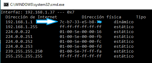 Buscamos la línea que coincide con nuestra IP y finalmente tendremos la MAC o dirección física del router.