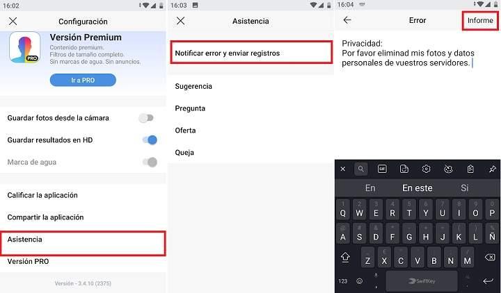 En la siguiente pantalla, escribimos un mensaje indicando que tenemos un problema de privacidad y que por favor, eliminen nuestras imágenes de sus servidores.