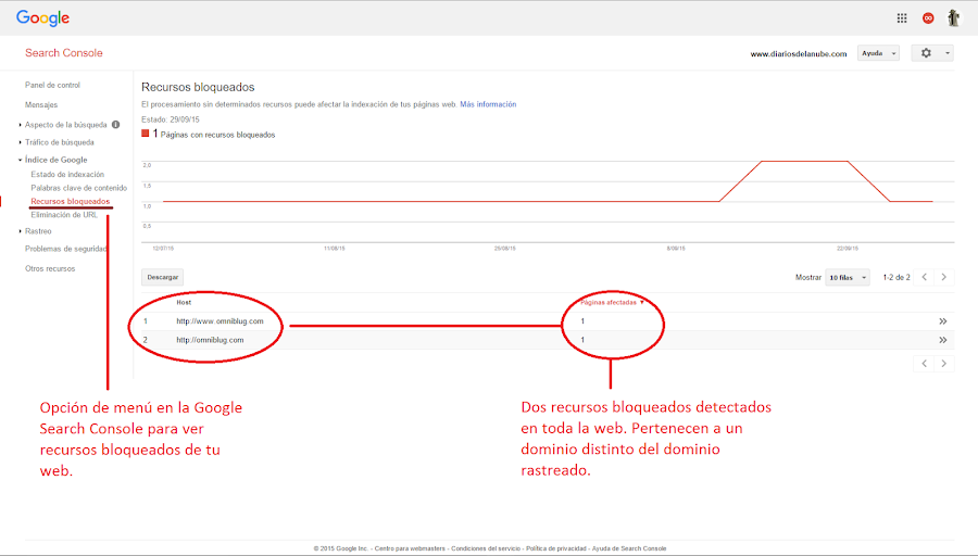 2) Utilizando el informe de recursos bloqueados de la Google Search Console, las herramientas para webmaster de Google podrás ver qué recursos tienes bloqueados y porqué en tu web.