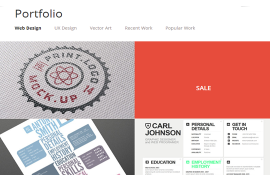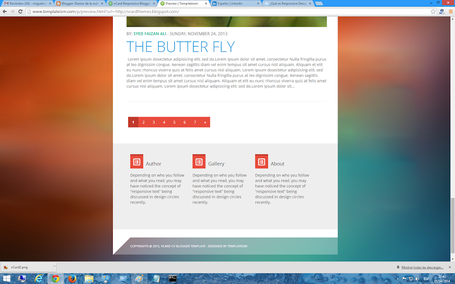 Puede mostrar entradas a continuación del portafolio a modo de Blog estándar y ofrece un pie de página con información completa sobre el autor donde podemos poner lo que necesitemos. NOTA sobre vCard de Templateism: Aunque la plantilla se ofrece gratuitamente, si quieres realizar cambios de colores o formato en ella, es decir: liberarla y quitarle el copyright, tendrás que pagar 30$ por ella.