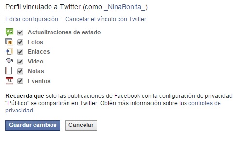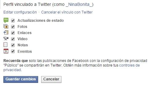 Y ahora simplemente desmarcamos lo que no queremos que se comparta en Tiwtter, en el caso de que no queramos algo claro!!!, si quieres que absolutamente todo lo que pongas en Facebook aparezca automáticamente en Twitter déjalo así y dale a "Guardar cambios"