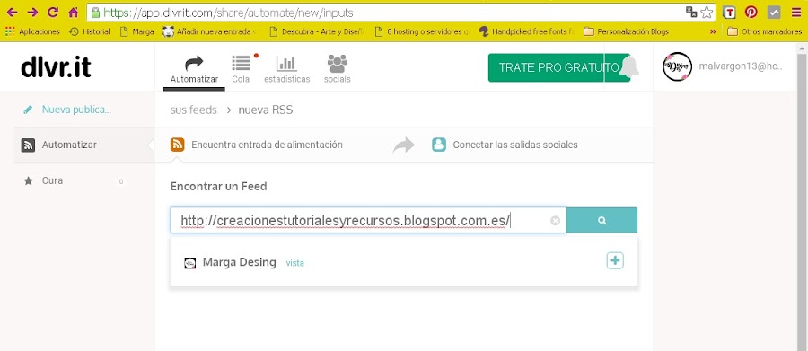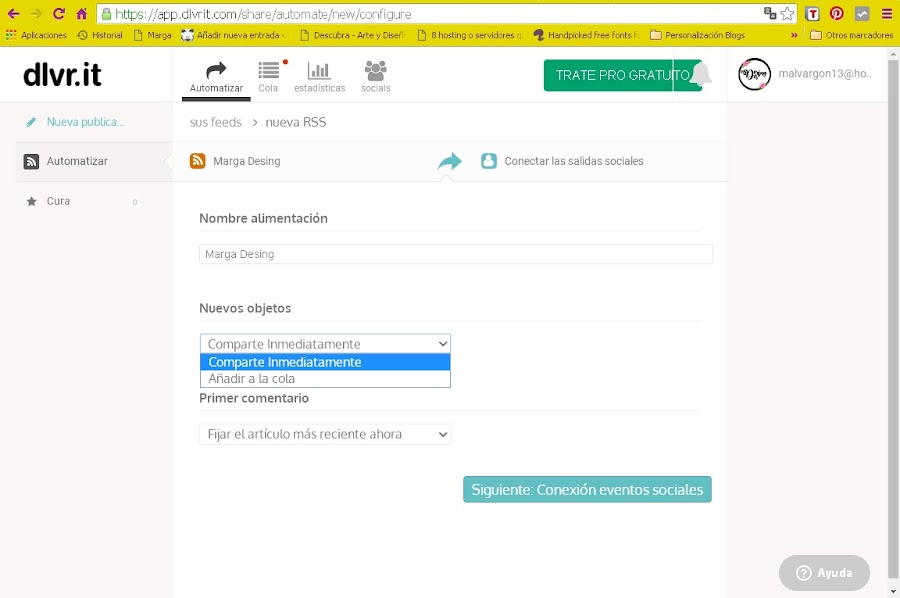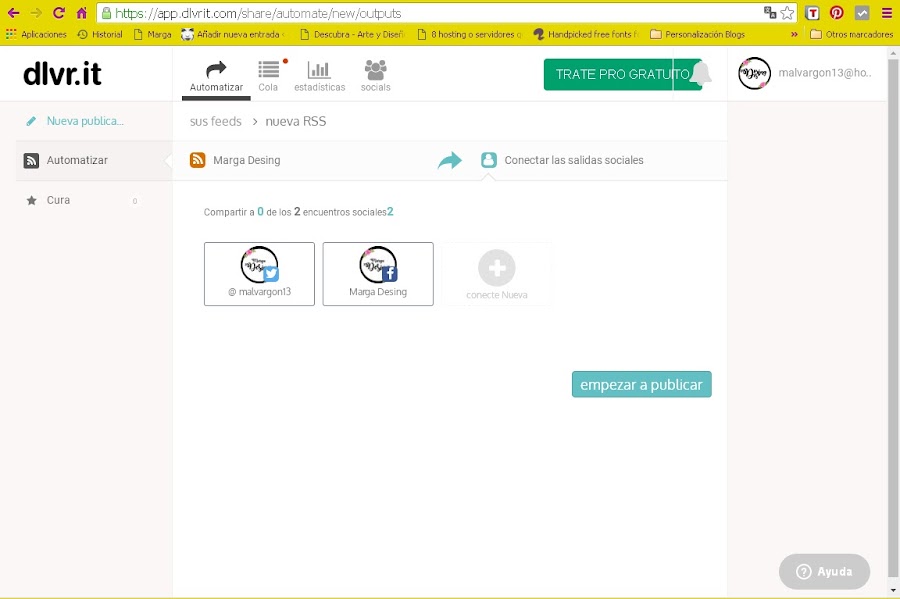 El mensaje que aparece, es para generar más tráfico y publicar en más redes sociales, pero hay que pagar una cuota mensual o anual. Así es que lo dejáis de lado (si no os interesa claro) y veis que aparecen mis dos cuentas de twitter y facebook ya vinculadas con una serie de opciones: