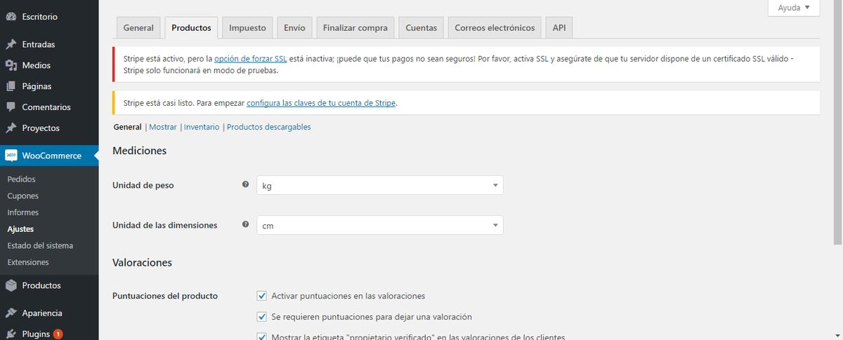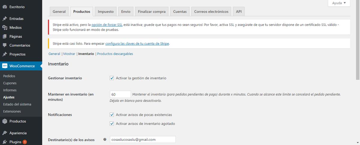 Inventario. Está opción es ideal si vendes productos físicos, ya que te permite llevar un inventario de los mimos y hacer saber al usuario cuantas unidades disponibles quedan. Para permitir todo esto lo primero que debes hacer es dejar marcada la opción de “Gestionar inventario”, a partir de ahí podrás configurarlo. “Mantener en inventario (en minutos)” te permite determinar los minutos que se debe mantener en inventario el producto hasta que el cliente pague, como te indica si no quieres esa opción simplemente deja en blanco el cuadro. Como te he mencionado puedes hacer que se te avise de cuando quedan pocas existencias o cuando se ha agotado el producto a través de “Notificaciones” y más abajo indicar el correo al que se debe avisar, algo que te recomiendo tener activado y poner un correo que utilices con frecuencia para no enterarte de repente de que no te queda de nada. Bien, si has dejado estas dos opciones marcadas como te he recomendado en “Umbral de pocas existencias” puedes indicar cuantas existencias deben quedar para que se te avise de que quedan pocas existencias y en “Umbral de inventario agotado” indicas cuantas debe haber para que se te avise de que no queda nada, claramente, lo lógico es que se te avise cuando queden 0 existencias, sin embargo tú mismo puedes cambiar el número. Por último puedes elegir que se oculten los productos agotados del catálogo a través de la opción “Visibilidad de inventario agotado” y también puedes elegir el formato en el que se mostrarán las existencias a los usuarios a través de “Formato de visualización del inventario” o si no quieres que se muestren.