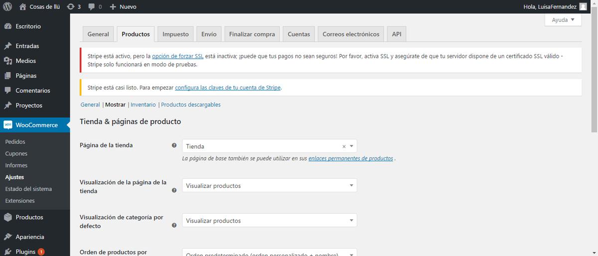 Mostrar. Como mencioné en el anterior artículo Woocommerce crea las tiendas por defecto, sin embargo en la opción “Página de la tienda” puedes elegir en cual de tus páginas quieres que se muestre las tienda y está opción la puedes combinar con “Visualización de la página de la tienda” para elegir si quieres que se muestren únicamente los productos, o solo las categorías o las categorías y los productos. Las mismas opciones nos aparecen en “Visualización de categoría por defecto”, aquí eliges lo que quieres que se muestre en la página de categoría, te recomiendo dejarlo con “Visualizar productos”. Por último ambas páginas se rematan con la opción “Orden de productos por defecto”, aquí simplemente eliges como quieres que se muestren los productos. Por último está la opción de como quieres que se añada el producto a la cuenta del cliente y que tamaño quieres que tengan las imágenes de producto, es decir, la destacada; la del catálogo, es decir, la que se mostrará en la página principal de la tienda; y, la de las miniaturas, es decir, las imágenes que acompañan a la imagen destacada del producto.