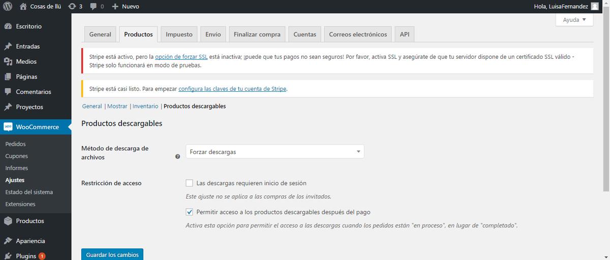 Productos descargables. Esta subpestaña únicamente la tienes que configurar si vendes cualquier producto descargable y solo cuenta con dos opciones: “Método de descarga de archivos”, donde puedes elegir si quieres que se fuercen las descargas, es decir, que si cuando compre el usuario directamente se le descargue el producto; X-Accel-Redirect/X-Sendfile, que es para usuarios avanzados ya que se necesita el servidor; y, solo redirigir, que llevaría al usuario a la página de descarga. La segunda opción de esta subpestaña es “Restricción de acceso” que cuenta a su vez con dos opciones: “Las descargas requieren inicio de sesión”, que obligaría a todos los usuarios a tener que estar registrados para poder descargarse el producto, lo que puede molestar a más de uno, por lo que te recomiendo dejarla desmarcada; y, “Permitir acceso a los productos descargables después del pago”, totalmente recomendado que tengas esta opción marcada, creo que no se necesita explicar que es, ya que te lo explican fácilmente, ni porqué es recomendable que la tengas marcada.