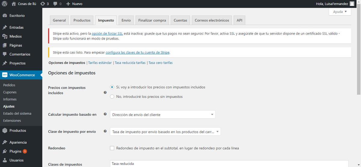 Opciones de impuesto. Como puedes ver la primera opción ya la tratamos con el asistente virtual sin embargo el resto no. “Calcular impuesto basado en” te permite saber que impuesto debe pagar el cliente basándose en donde esté situado, hacia donde vaya el paquete… Ya sabes que el impuesto que se le debe imponer a un producto depende del país donde se encuentre el comprador; “Clase de impuesto por envío”, te permite elegir el plus que se le va a sumar al comprador por el envío, dependiendo de la tienda a veces hay una tarifa estándar y a veces simplemente se va sumando según los productos. La opción de “Redondeo” sirve para redondear el impuesto, es decir, que en vez de ser 14,99 sean 15, mientras que la opción de “Clases de impuestos adicionales” te permite añadir impuestos adicionales. Por último, para terminar con esta subpestañas tenemos las opciones relacionadas con como se muestran los impuestos: primero puedes elegir si se muestra en la tienda y/o en el carrito con el impuesto incluido y si le das a que “IVA incluido” te permiten escribir en la opción “Sufijo a mostrar en el precio” el texto que va a aparecer al lado del precio, es decir, “IVA incluido” o lo que tú decidas. Y en la última opción de esta subpestaña, “Visualización del total de impuestos”, te permite elegir si quieres que se detalle el precio final o si simplemente quieres que aparezca un precio único, yo te recomiendo que elijas lo primero porque si un cliente ve que se pasa de un precio a otro sin explicación te puede poner de estafador.