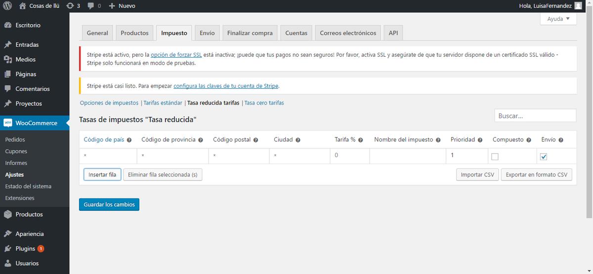 Tarifa estándar. Esta pestaña sirve para configurar los impuestos que aplicarás en tu tienda y a que países y regiones se destinarán cada uno. Para esta subpestaña necesitaríamos todo un artículo, por eso te dejo el artículo de como configurar IVA y otros impuestos de Woodemia, donde se habla de esta subpestaña, se pone un ejercicio práctico y sales de él sabiendo un montón.