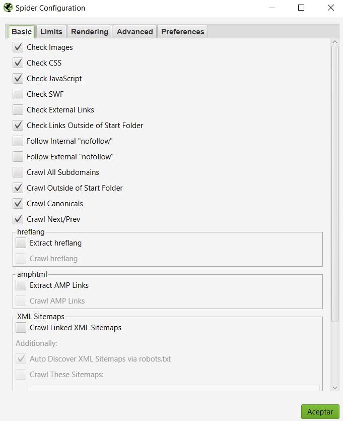 Como en todos los crawleos, primero debemos pensar qué nos interesa rastrear. Si, por ejemplo, no existen páginas en flash (Check SWF), si no hay subdominios (Crawl All Subdomains), no hay páginas otros idiomas (Extract/Crawl hreflang) o no existen páginas en AMP (Extract/Crawl AMP Links), deberemos desmarcar ésas casillas: