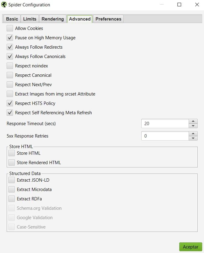 El resto de la configuración tiene que ser la misma que la usada en la web actual para poder hacer el mismo análisis del status de las URLs, metaetiquetas, etc.