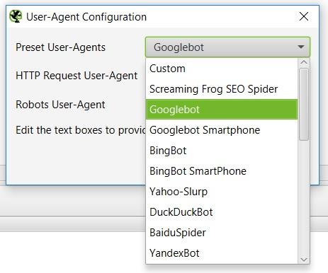 Otra comprobación que debemos hacer, es emular el rastreo que haría GoogleBot de la web por si se nos ha escapado algo durante los primeros análisis. Para ello, sólo hay que cambiar el User-Agent dentro de la configuración de Screaming Frog.