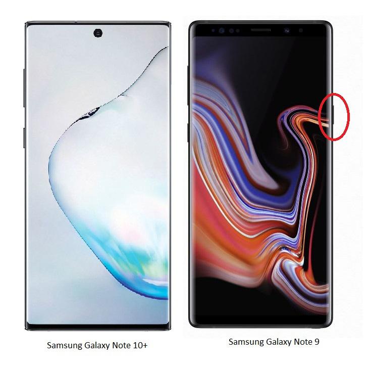 El Galaxy Note 10 cuenta con 6,3 pulgadas alcanzando una resolución FullHD+ (2.280 x 11.080 pixeles), mientras el Galaxy Note 10+ cuenta con 6,8 pulgadas alcanzando una resolución WQHD+ (3.040 x1.440 pixeles). Estos dos terminales comparten el mismo diseño, ya que la tendencia de incluir más pantalla en los paneles frontales ha llegado para quedarse. Por lo cual, Samsung brindan un aprovechamiento de más del 90% en el panel frontal sin recurrir al notch, optando por una cámara de 10 megapíxeles (en ambas versiones) ubicada justo en el centro de la parte superior del panel frontal y un lector de huellas ultrasónico integrado en la pantalla.