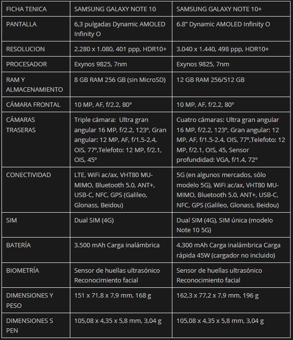 El modelo Galaxy Note 10 5G cuenta con las mismas especificaciones del modelo Galaxy Note 10+. Su diseño no sufre ningún cambio, las únicas diferencias que hay es dicha conectividad y que su peso aumenta 2 gramos más .