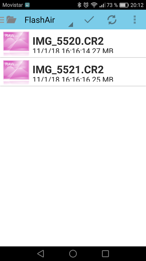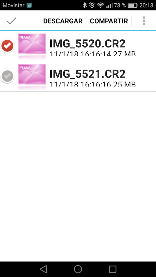 4. En la App del terminal móvil que deberás descargar del market correspondiente, dependiendo de si usas IOS o Android, verás la lista de fotos, tanto JPEG como RAW que hay en la tarjeta y tendrás una opción para pasarlas desde la cámara al móvil. Las que has pasado quedarán marcadas para la próxima vez que quieras descargar las siguientes fotos.