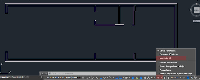 Ahora sí que vamos a comenzar a realizar nuestra vista 3D, primero activamos el modo 3D de Autocad seleccionado en la pestaña inferior del programa como vemos en esta imagen: