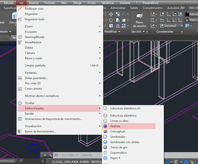 Ahora podemos cambiar el ESTILO VISUAL del dibujo, pulsamos en la barra de herramientas VER – ESTILOS VISUALES y en el desplegable nosotros hemos elegido REALISTA. Puedes elegir la opción que mejor se adapten a tus necesidades.Nuestro 3D se verá como en la imagen inferior.