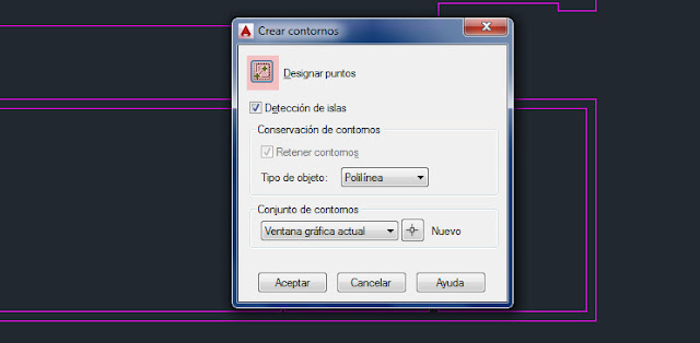 Nos tenemos que asegurar que todo el dibujo esté cerrado, ahora crearemos un CONTORNO. Para hacer esto activamos el comando CONTORNO. En la barra de comando escribimos CONTORNO pulsamos INTRO y nos aparecerá una nueva ventana como la de la imagen inferior. Pulsamos en el botón de DESIGNAR PUNTOS.