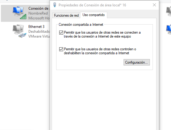 Una vez entremos en propiedades, tendremos que hacer click en Uso Compartido, y seleccionar la red que hemos creado, para permitir que nuestra red WiFi pueda acceder a Internet.
