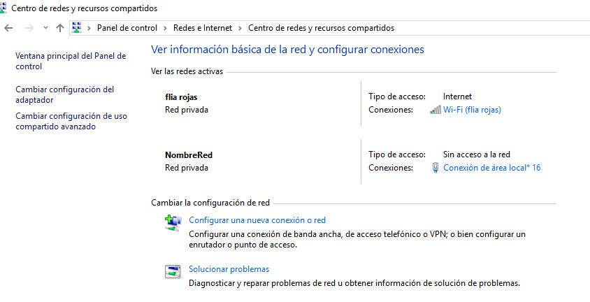 Accedemos desde el Panel de Control al Centro de Redes y Recursos compartidos, y seleccionar la opción Cambiar configuración del Adaptador.