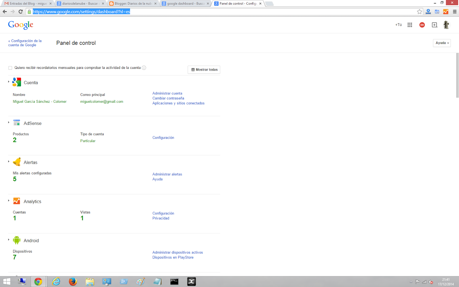 Desde tu cuenta de Google, la que aparece en primer lugar en el dashboard, podrás desde administrar al detalle de la misma (con todos sus datos, las notificaciones que quiere ver) hasta el conjunto de servicios de terceros (aplicaciones de empresas no Google) que has conectado a tu cuenta, podrás eliminar aquellos que no te interesen.