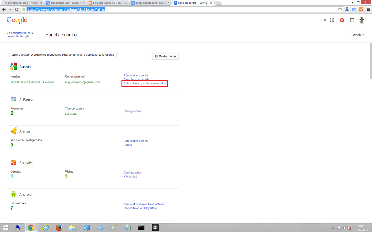 Al hacer "clic" en Aplicaciones y sitios conectados (como te he marcado en la pantalla superior), podrás visualizar las aplicaciones de terceros que tienes conectadas a tu cuenta Google: