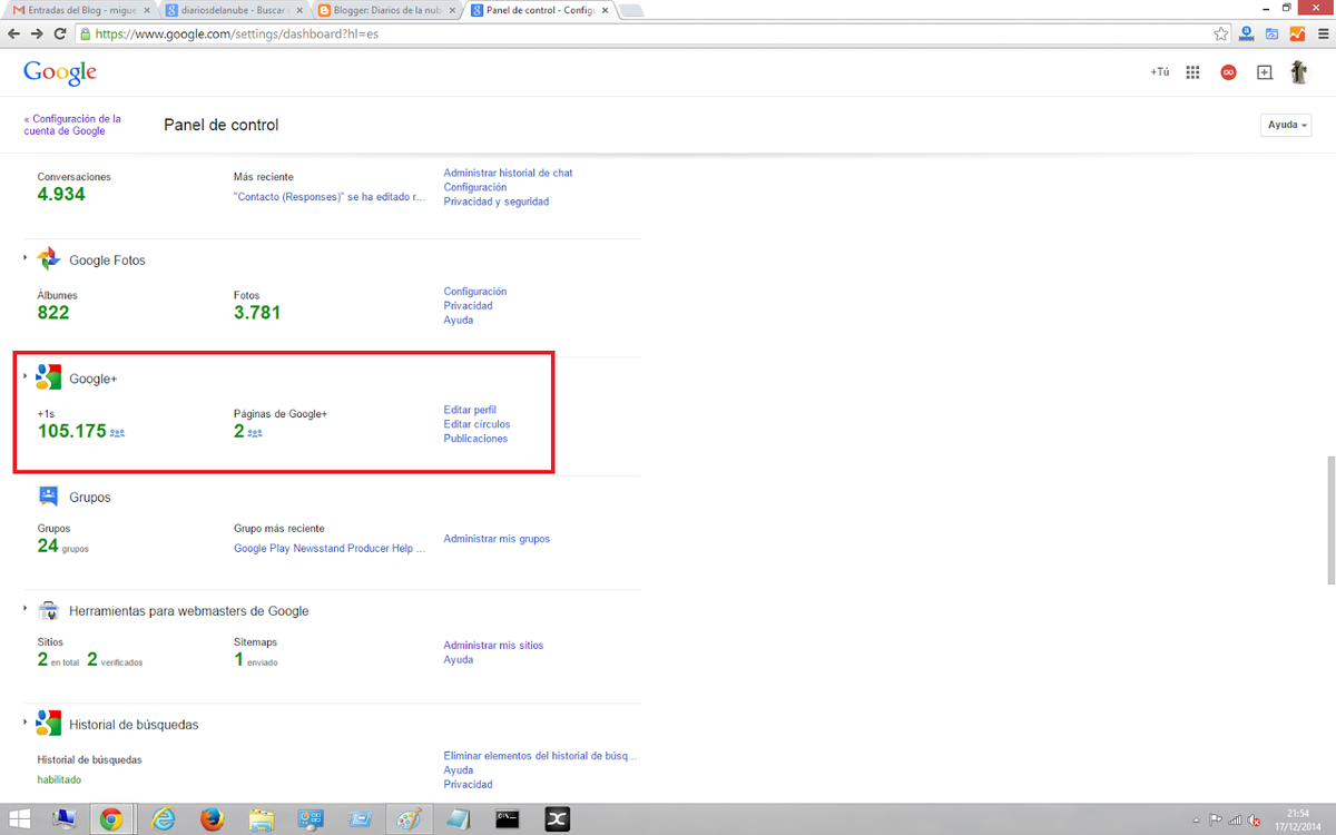 Creadores de contenido de todo el mundo valoran bastante esta información, lo cierto es que no muchos saben llegar hasta ella con facilidad. Simplemente, dentro de Google Dashboard desplázate con el scroll lateral hasta que encuentres la indicación de Google+ (como puedes ver en la pantalla inferior remarcada en rojo):