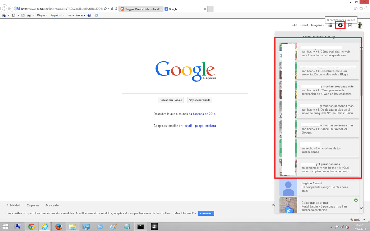 Al hacer "clic" en el icono que te he remarcado en rojo en la pantalla superior, accederás al listado de todas las publicaciones que has realizado que han recibido un +1 y qué persona ha realizado ese +1.