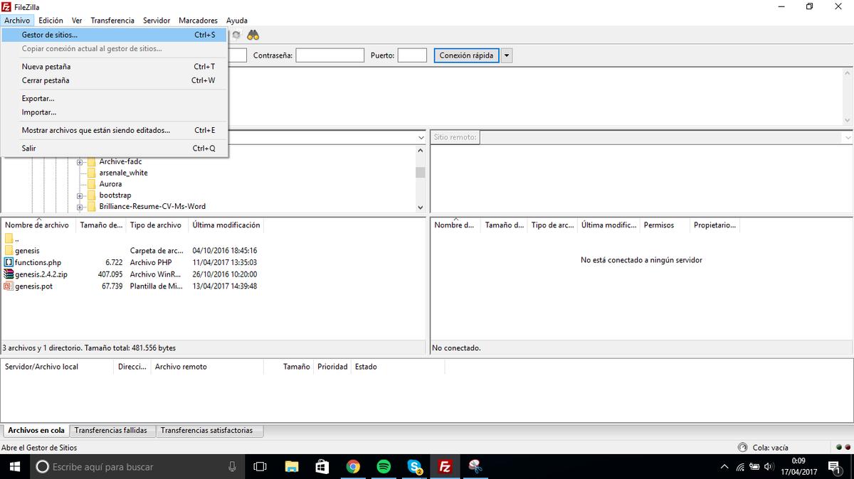 Una vez en ella añadiremos nuestra web para poder ver los archivos del servidor. Para ello nos fijaremos en el menú y dentro de él en la pestaña “Archivo”. En ella encontraremos varias opciones, la que nos interesa es “Gestor de sitios”.
