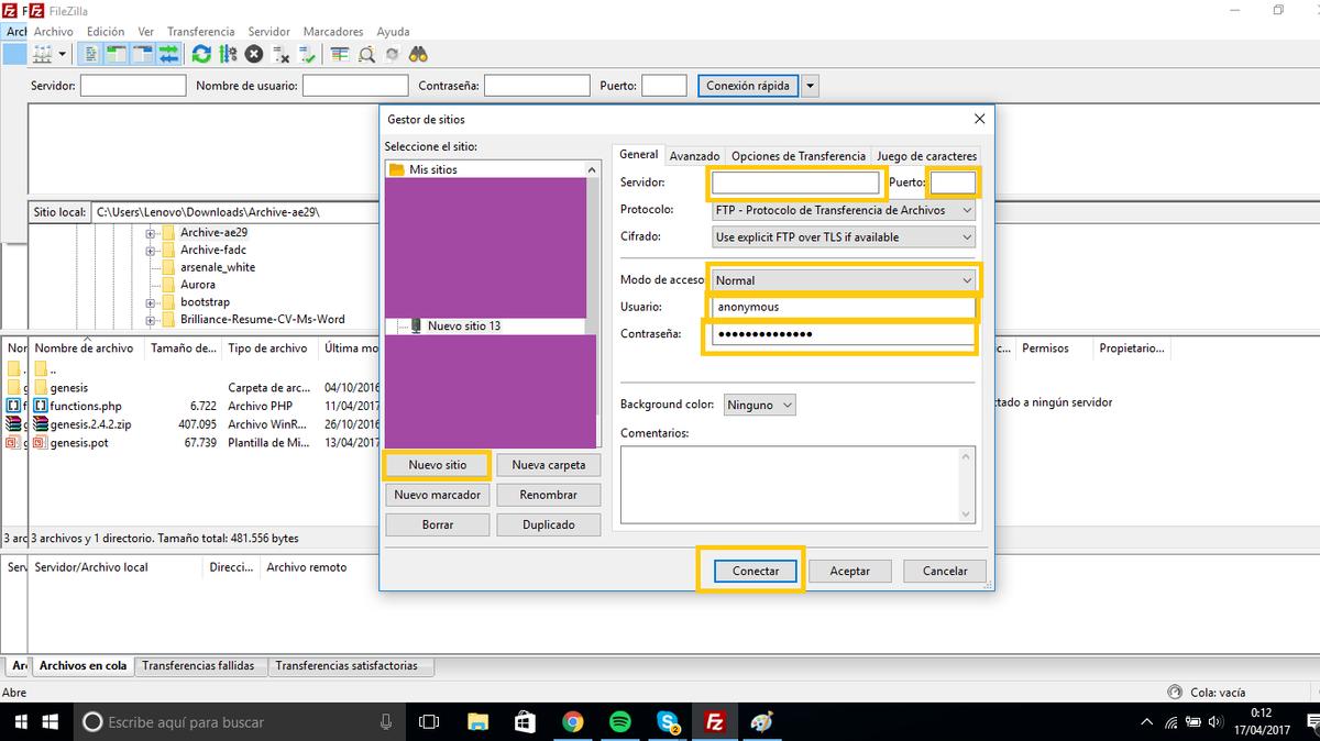 Eso abrirá una nueva ventana con varias opciones, la que nos interesa esta vez es “Nuevo sitio”. Esa opción generará una nueva sección donde tendremos que poner los datos que hemos apuntado anteriormente: servidor, puerto, para conexiones FTP siempre 21; el protocolo y el cifrado lo dejamos como viene por defecto, mientras que en modo de acceso ponemos “Normal”, para poder poner nuestro usuario y contraseña. Una vez introducidos todos los datos le damos a “Conectar”