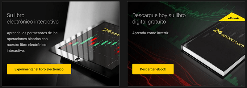 Como uno de sus grandes contenidos destinados a la formación, 24Option ha creado un libro digital interactivo dirigido a todos los traders que utilicen este broker como su soporte de confianza. Se trata de una guía visual exclusiva a la que podemos acceder directamente desde la página web, pudiendo consultarla en todo momento.