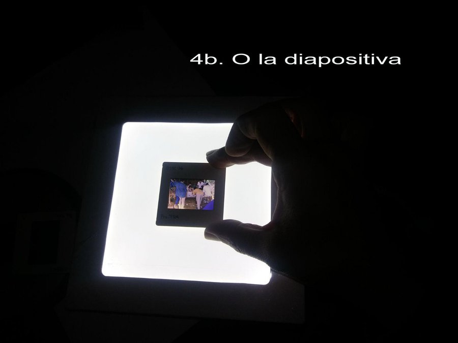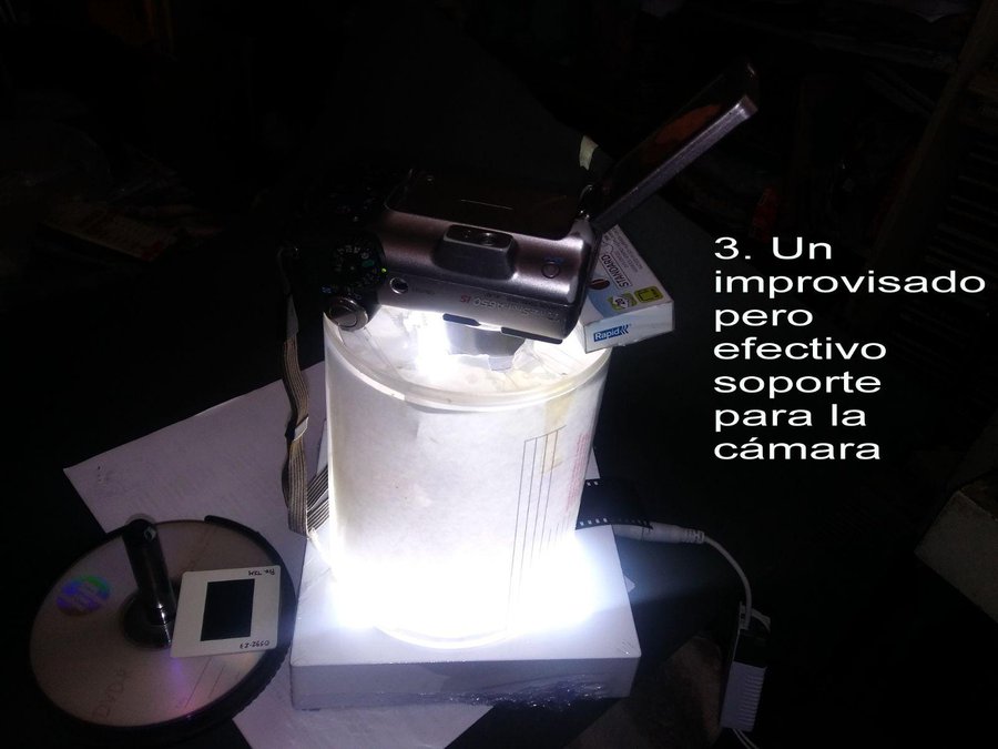 3. Un soporte lo suficientemente robusto para sujetar firmemente la cámara en sentido horizontal (trípode) o, como en las imágenes adjuntas, para que esta sujeción pueda hacerse en sentido vertical, una caja de cartón o un tubo (como un recipiente de discos compactos perforado en el centro). Este último recurso es que yo empleo con mayor versatilidad, pues me permite utilizar incluso los teléfonos celulares para hacer las fotografías, sin necesidad de adaptar artilugios para sujetar las tiras de película o diapositivas.